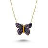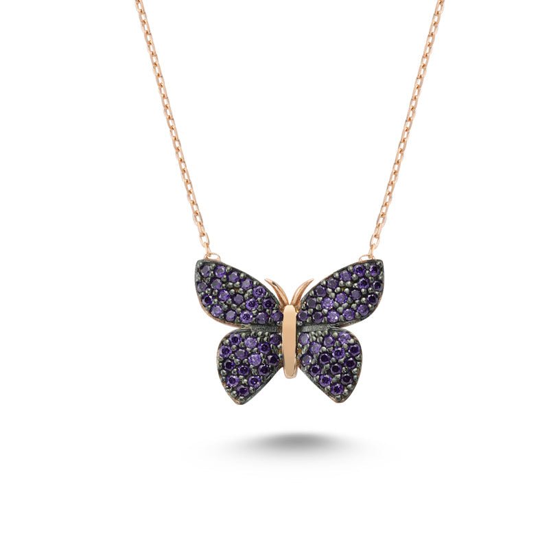 • The purple butterfly necklace in silver contains a rich touch of purple cz crystals. It is a great necklace to wear with spring and summer outfits. You can also find this necklace in rose gold and gold.